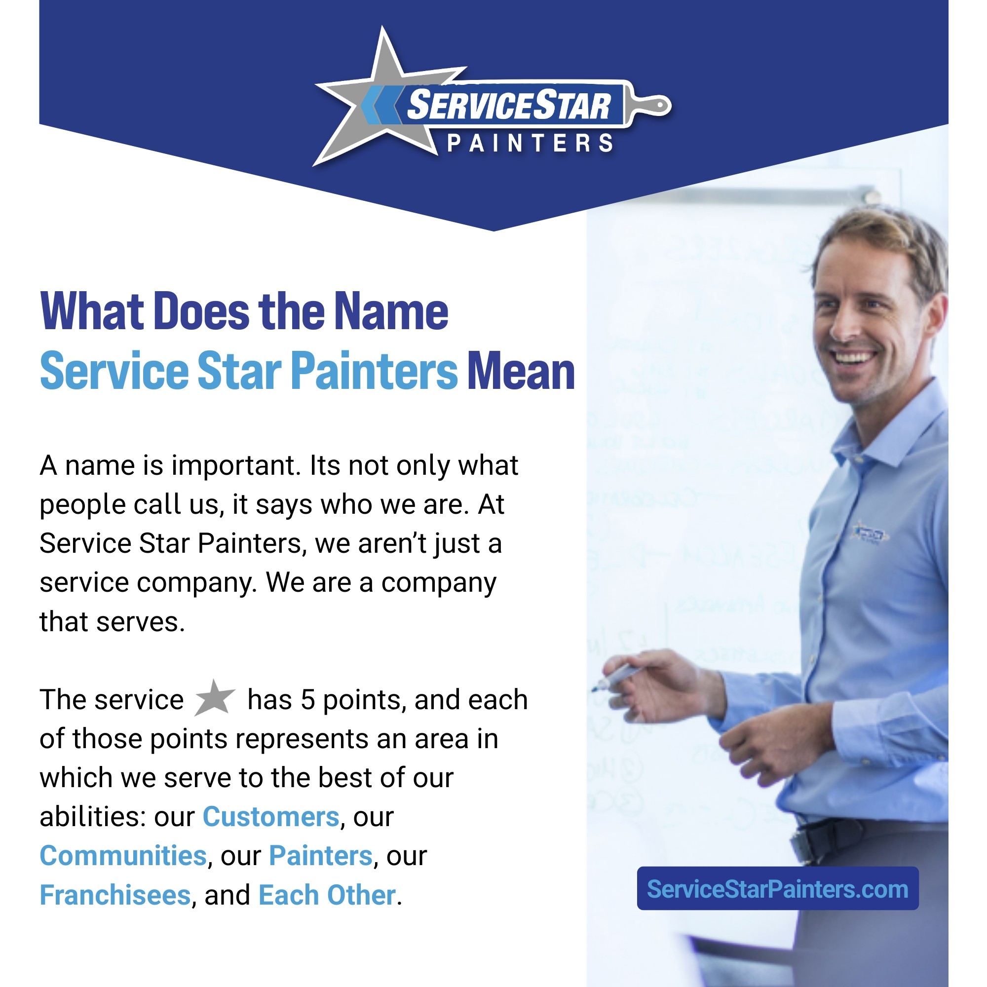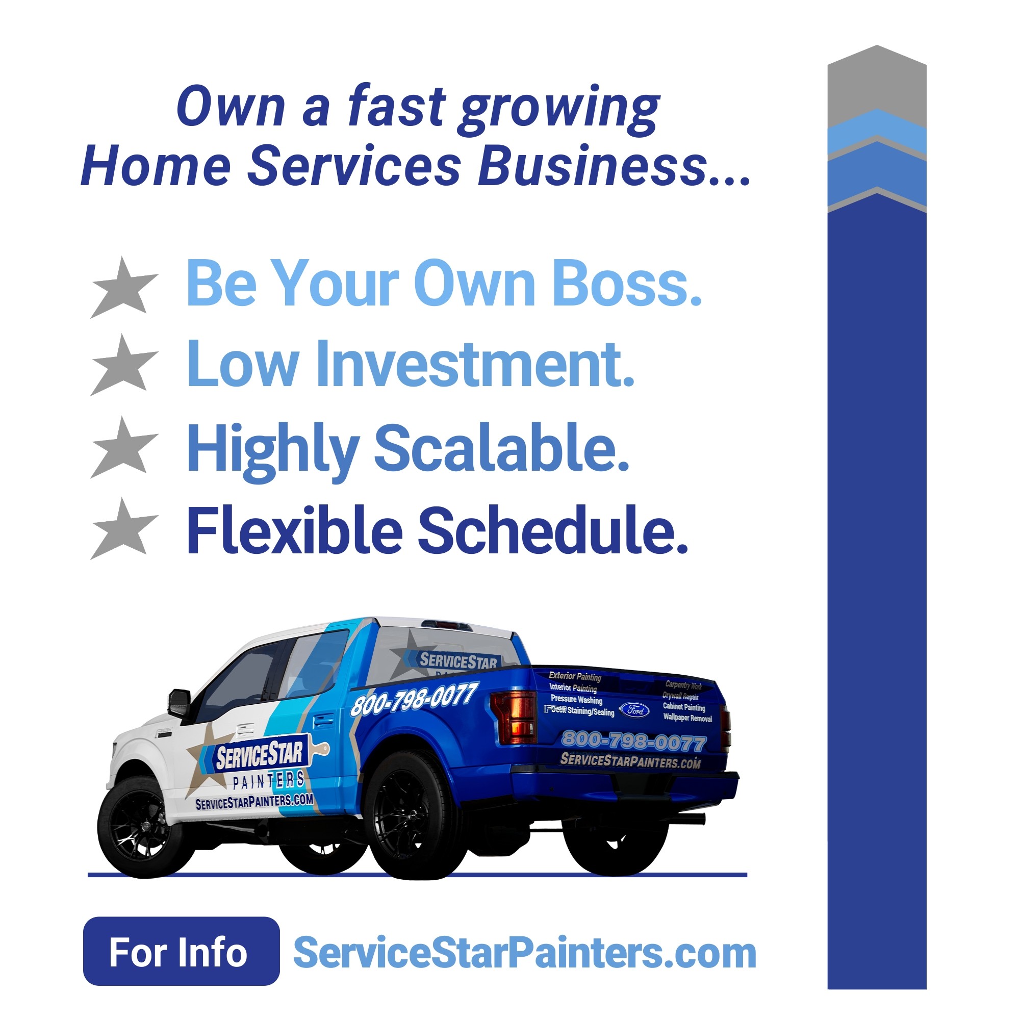 Spoiler alert, as an owner you will not be painting. This is a business involving marketing, sales, and production management of professional independent painting contractors. Painting is a simple, low overhead, mobile business that allows freedom and flexibility of your time and schedule. Owning a Service Star Painters franchise is your opportunity to be your own boss, lead others, impact your community, and build a valuable asset.